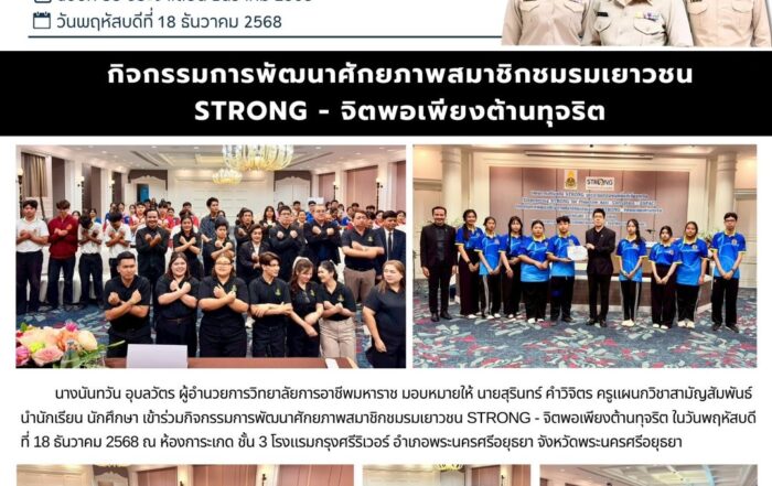 ศิริวัฒน์ มูลสาร2025-12-19T15:41:12+07:00กิจกรรมการพัฒนาศักยภาพสมาชิกชมรมเยาวชน STRONG – จิตพอเพียงต้านทุจริต ในวันพฤหัสบดีที่ 18 ธันวาคม 2568 ณ ห้องการะเกด ชั้น 3 โรงแรมกรุงศรีริเวอร์ อำเภอพระนครศรีอยุธยา จังหวัดพระนครศรีอยุธยาศิริวัฒน์ มูลสาร2025-12-19T15:41:12+07:0019/12/2025|0 Comments
