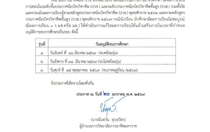 โชติกา ประภากุลธวัช2026-01-23T09:13:28+07:00ประกาศวิทยาลัยฯ เรื่อง กำหนดวันอนุมัติจบหลักสูตรประกาศนียบัตรวิชาชีพ (ปวช.) และหลักสูตรประกาศนียบัตรวิชาชีพชั้นสูง (ปวส.) ประจำปีการศึกษา 2568โชติกา ประภากุลธวัช2026-01-23T09:13:28+07:0023/01/2026|0 Comments