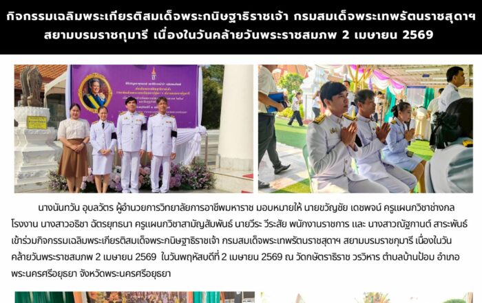 ศิริวัฒน์ มูลสาร2026-04-03T16:34:15+07:00โครงการพัฒนาทักษะฐานสมรรถนะอาชีพ (Up Skill, Re Skill) หลักสูตรการฝึกยกระดับฝีมือ สาขาช่างไฟฟ้า ตามมาตรฐานฝีมือแรงงาน สาขาอาชีพช่างไฟฟ้าภายในอาคาร ระดับ 1 ในวันศุกร์ที่ 27 มีนาคม 2569 และ วันจันทร์ที่ 30 มีนาคม 2569 ณ ห้องประชุมสุวรรณโสรัต และแผนกวิชาช่างไฟฟ้ากำลัง วิทยาลัยการอาชีพมหาราชศิริวัฒน์ มูลสาร2026-04-03T16:34:15+07:0003/04/2026|0 Comments