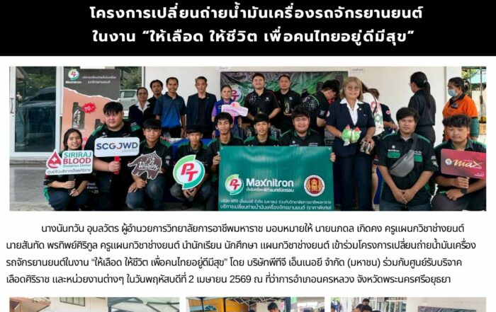 ศิริวัฒน์ มูลสาร2026-04-03T16:38:08+07:00โครงการเปลี่ยนถ่ายน้ำมันเครื่องรถจักรยานยนต์ในงาน “ให้เลือด ให้ชีวิต เพื่อคนไทยอยู่ดีมีสุข” โดย บริษัทพีทีจี เอ็นเนอยี จำกัด (มหาชน) ร่วมกับศูนย์รับบริจาคเลือดศิริราช และหน่วยงานต่างๆ ในวันพฤหัสบดีที่ 2 เมษายน 2569 ณ ที่ว่าการอำเภอนครหลวง จังหวัดพระนครศรีอยุธยาศิริวัฒน์ มูลสาร2026-04-03T16:38:08+07:0003/04/2026|0 Comments