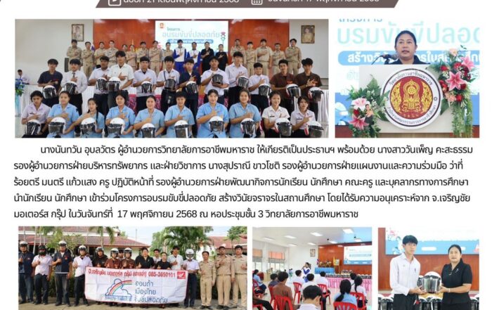โครงการอบรมขับขี่ปลอดภัย สร้างวินัยจราจรในสถานศึกษา โดยได้รับความอนุเคราะห์จาก จ.เจริญชัย มอเตอร์ส กรุ๊ป ในวันจันทร์ที่ 17 พฤศจิกายน 2568 ณ หอประชุมชั้น 3 วิทยาลัยการอาชีพมหาราช