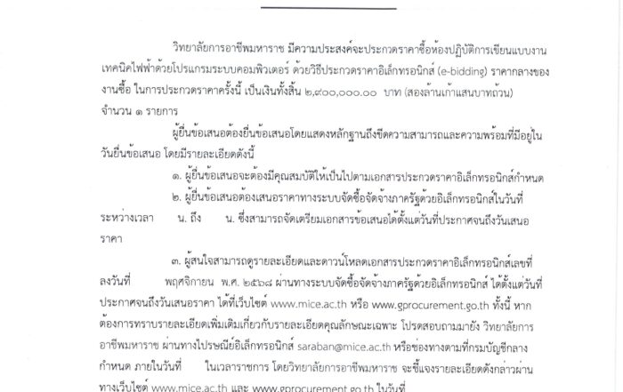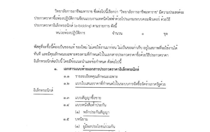 ประกาศวิทยาลัยฯ เรื่อง ร่างประกวดราคาซื้อห้องปฏิบัติการเขียนแบบเทคนิคไฟฟ้าด้วยโปรแกรมระบบคอมพิวเตอร์ ด้วยวิธีประกวดราคาอิเล็กทรอนิกส์ (e-bidding) ครั้งที่ 2