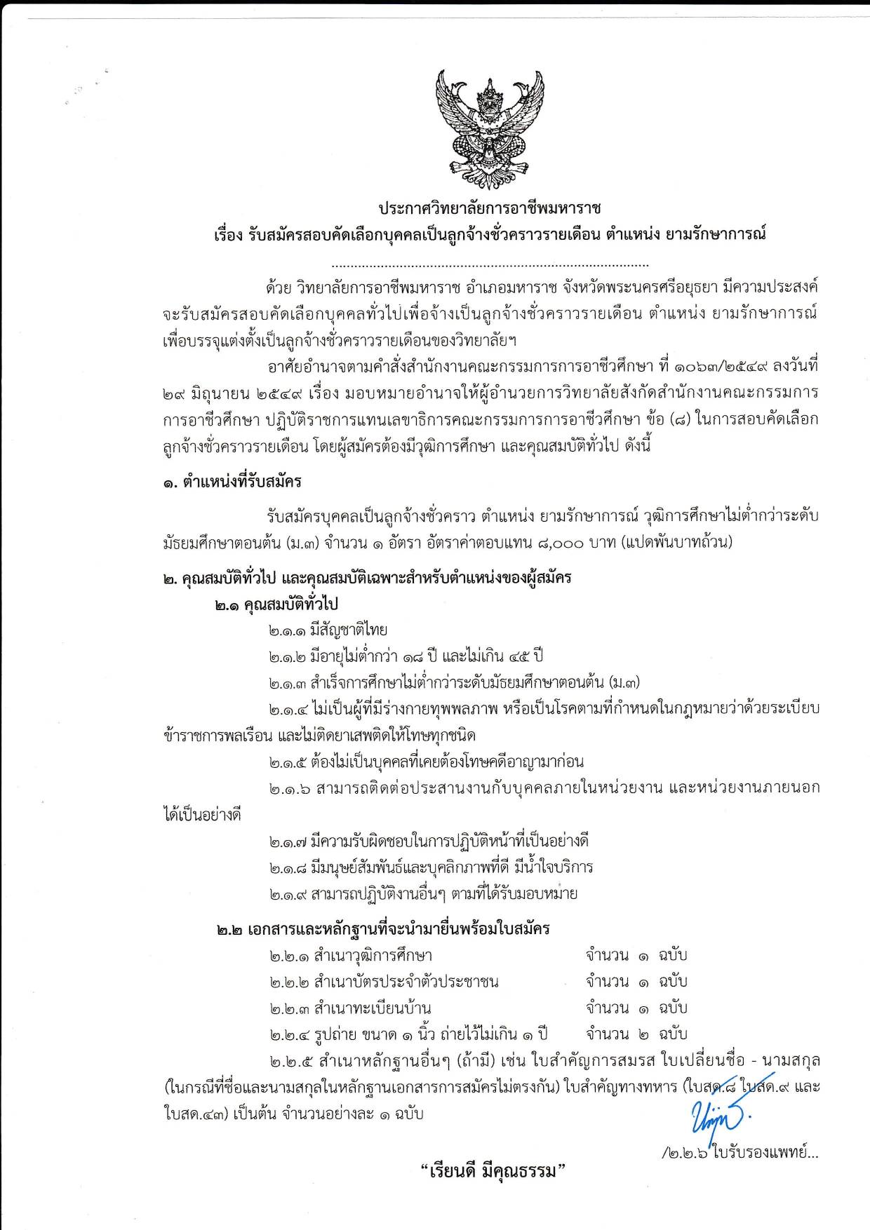 ประกาศวิทยาลัยฯ เรื่อง รับสมัครสอบคัดเลือกบุคคลเป็นลูกจ้างชั่วคราวรายเดือน ตำแหน่ง ยามรักษาการณ์