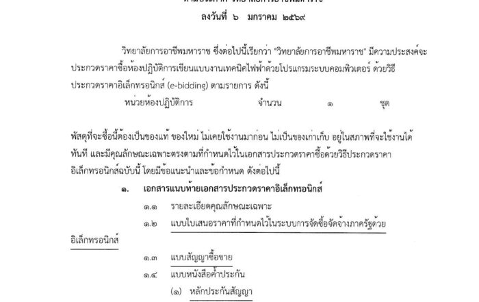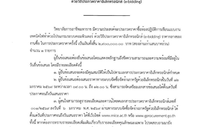 • ประกาศวิทยาลัยฯ เรื่อง ประกวดราคาซื้อห้องปฏิบัติการเขียนแบบเทคนิคไฟฟ้าด้วยโปรแกรมระบบคอมพิวเตอร์ ด้วยวิธีประกวดราคาอิเล็กทรอนิกส์ (e-bidding)