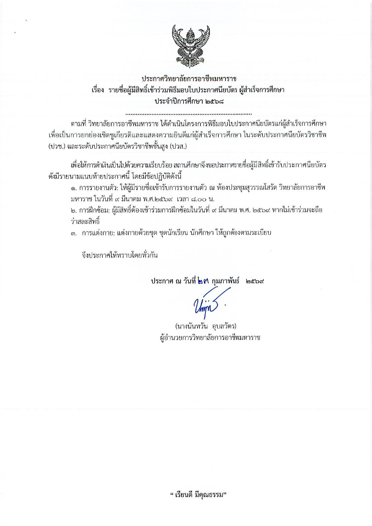 ประกาศวิทยาลัยฯ เรื่อง รายชื่อผู้มีสิทธิ์เข้าร่วมพิธีมอบใบประกาศนียบัตร ผู้สำเร็จการศึกษา ประจำปีการศึกษา 2568
