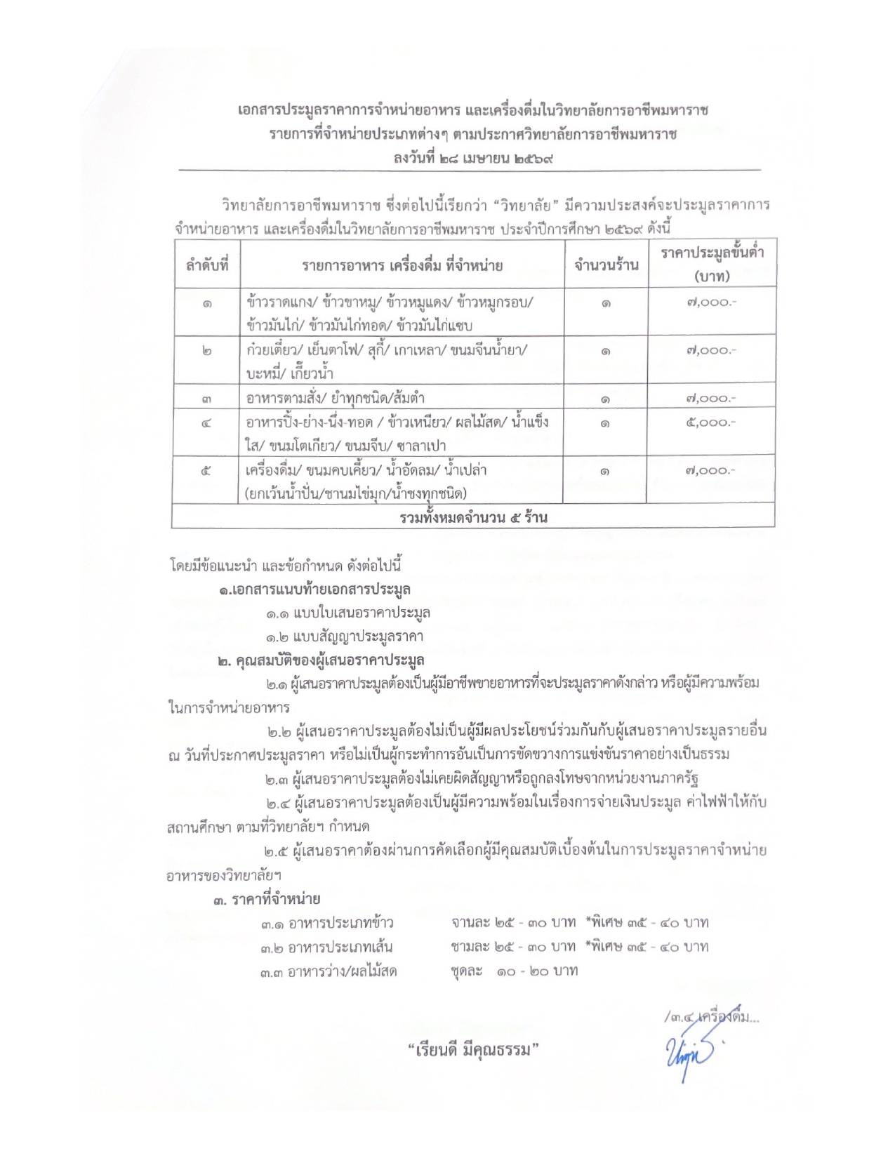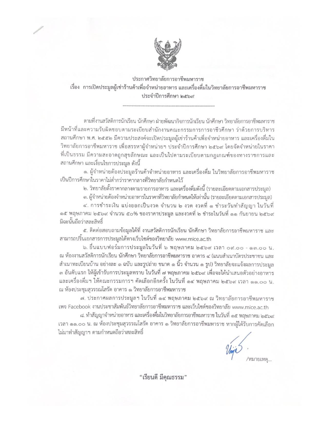 ประกาศวิทยาลัยฯ เรื่อง การเปิดประมูลผู้เช่าร้านค้าเพื่อจำหน่ายอาหาร และเครื่องดื่ม ในวิทยาลัยการอาชีพมหาราช ประจำปีการศึกษา 2569