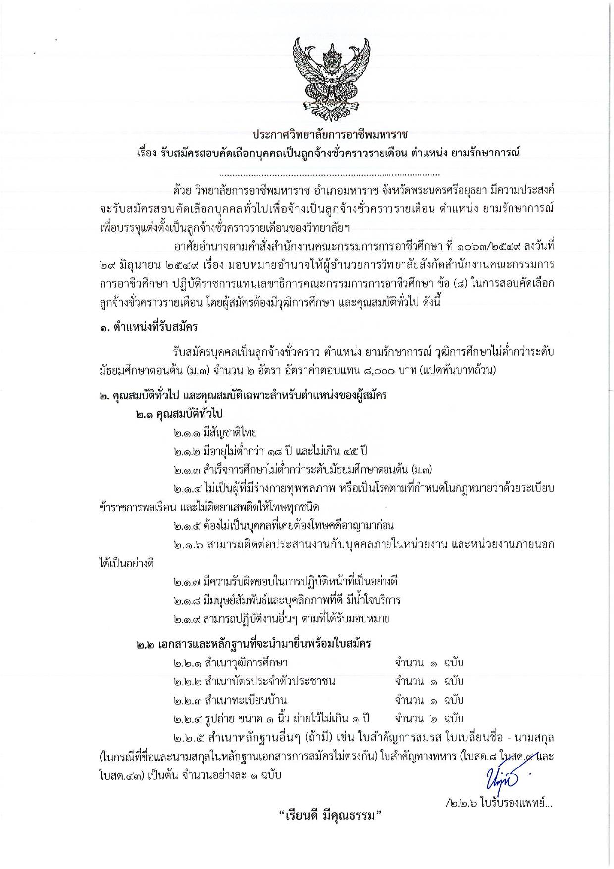 ประกาศวิทยาลัยฯ เรื่อง รับสมัครสอบคัดเลือกบุคคลเป็นลูกจ้างชั่วคราวรายเดือน ตำแหน่ง ยามรักษาการณ์