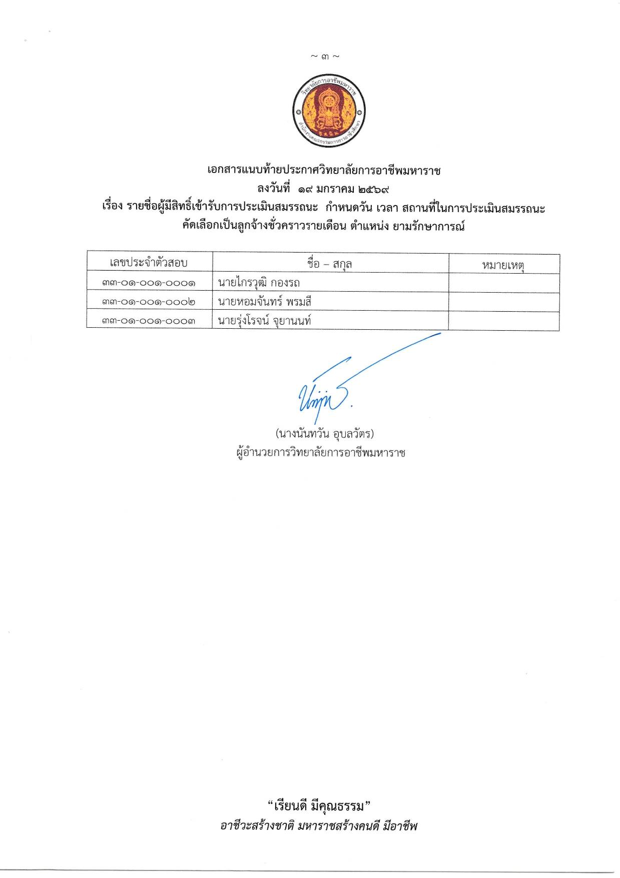 ประกาศวิทยาลัยฯ เรื่อง รายชื่อผู้มีสิทธิ์เข้ารับการประเมินสมรรถนะ คัดเลือกเป็นลูกจ้างชั่วคราวรายเดือน ตำแหน่ง ยามรักษาการณ์