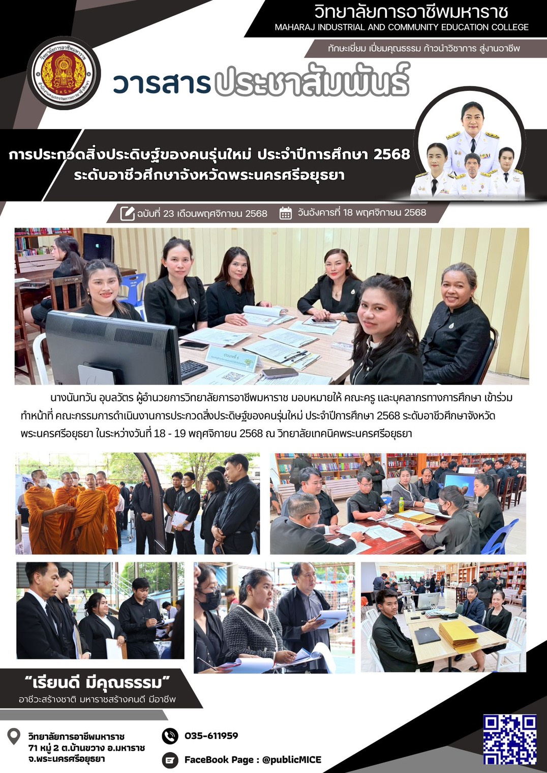 • การประเมินองค์การมาตรฐานดีเด่น องค์การนักวิชาชีพในอนาคตแห่งประเทศไทย ประจำปีการศึกษา 2568 ระดับอาชีวศึกษาจังหวัดพระนครศรีอยุธยา ในวันจันทร์ที่ 24 พฤศจิกายน 2568 ณ ห้องประชุมอโยธยา วิทยาลัยอาชีวศึกษาจังหวัดพระนครศรีอยุธยา