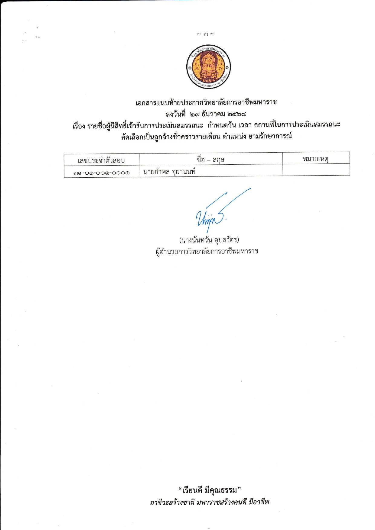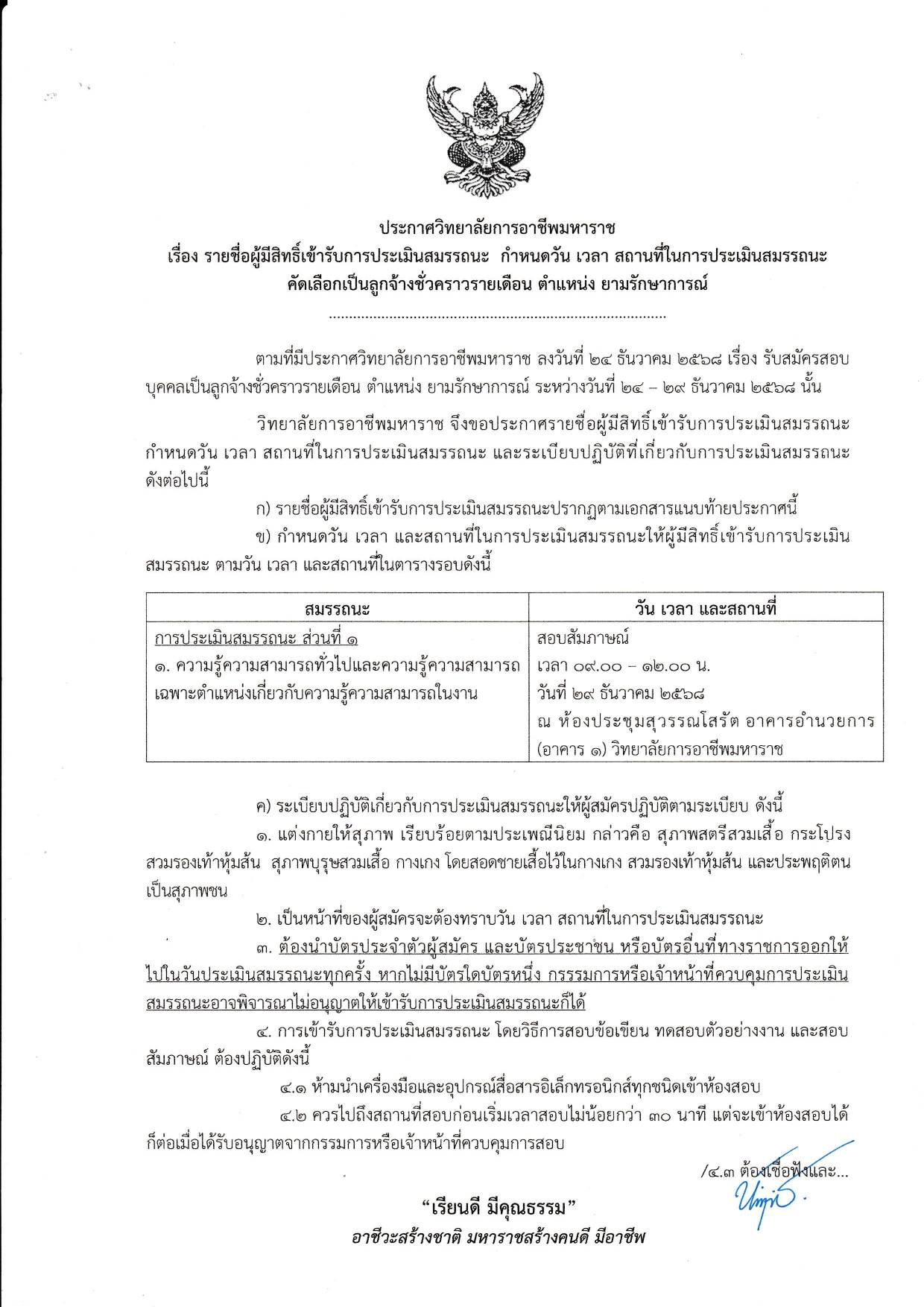 ประกาศวิทยาลัยฯ เรื่อง รายชื่อผู้มีสิทธิ์เข้ารับการประเมินสมรรถนะ คัดเลือกเป็นลูกจ้างชั่วคราวรายเดือน ตำแหน่ง ยามรักษาการณ์